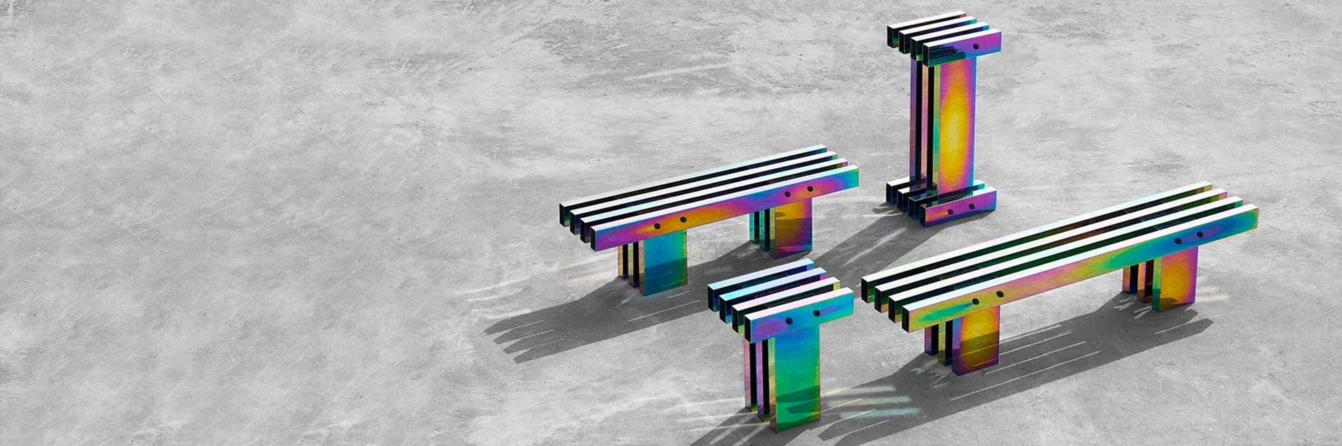 The street furniture utilises a combination of slatted vertical and horizontal box section beams that intersect in clean straight lines, whilst forming a strong and robust structural strength. The hypnotic colours then bring the structures to life as the light creates iridescent colour changes across the surfaces as viewer move around the structures.