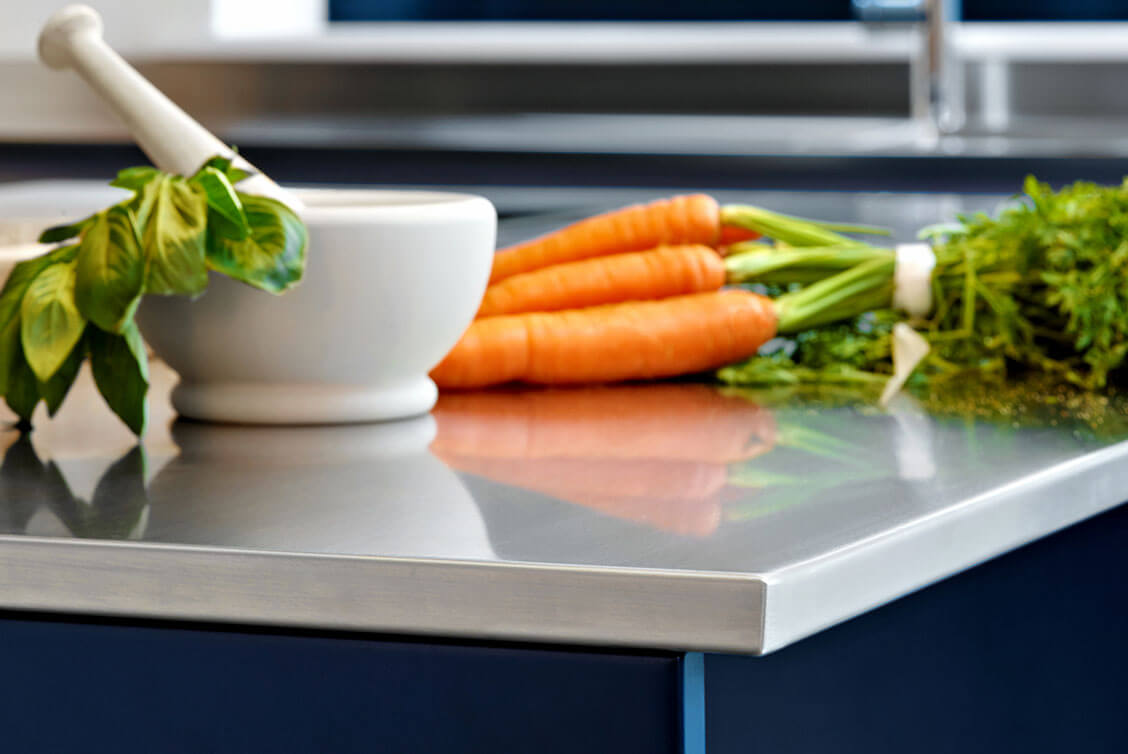 As well as its heat-resistance, durability, high hygiene properties and robustness, our steel is also the most environmentally-friendly option on the market: made from raw sheets that comprise around 60 per cent recycled materials, the end product is also fully recyclable. Take a look at the wide choice of products we offer for your kitchen, including a variety of different sinks and hand-wash basins, plus a choice of handle for cupboards and drawers. Worktops can be made to any length and combined with any configuration of units.