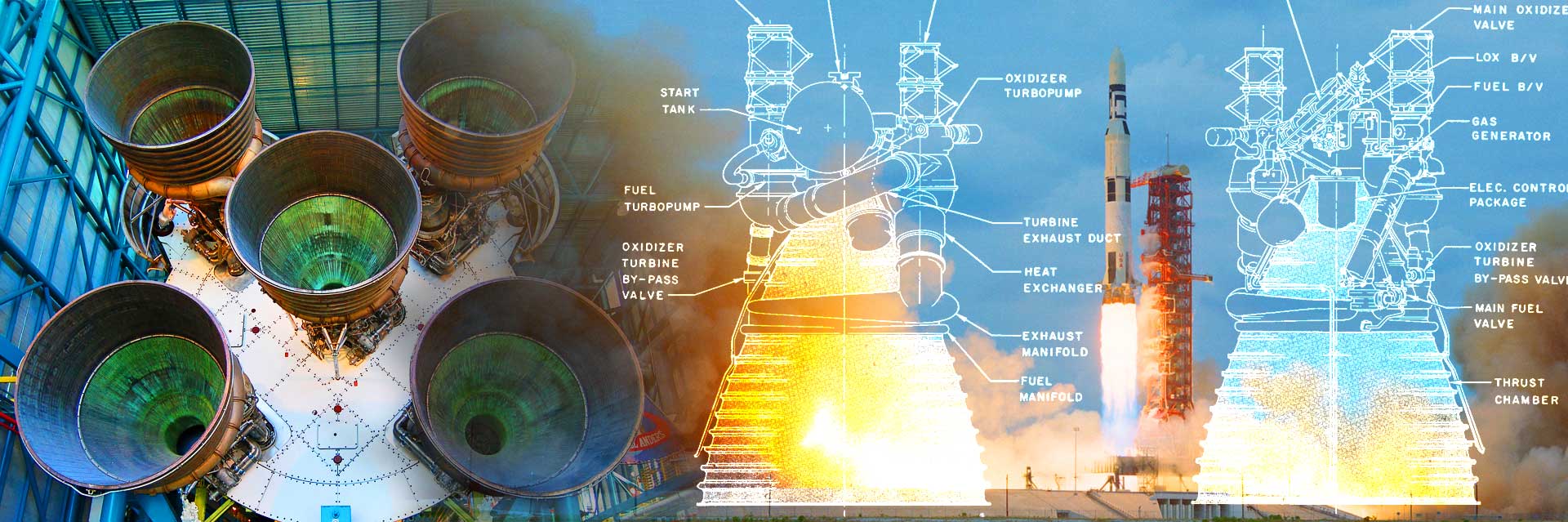 The 1.5-million-pound-thrust F-1 engine powered the first stage of the 363-foot-long Saturn V rocket that carried astronauts to the Moon between 1969 and 1972 as part of the Apollo program, completing six successful landing missions. The first stage of the Saturn V had five F-1s with a combined takeoff thrust of 7.5 million pounds. A fully fueled Saturn V weighs 6.5 million pounds. These engines are made of stainless steel, for example the thrust chamber is made of stainless steel tubing with walls that are 0.012 inches thick. The injector surface of the thrust chamber is also porous and consists of layers of stainless steel wire mesh.